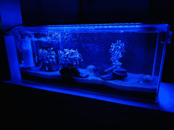 タイマー制御で照度と色を変えられるので、9時から18時までは昼光色、18時から23時までは真っ青に設定。