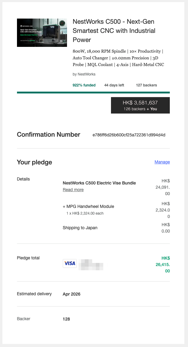 128番目のバッカーだったみたいで、Electric ViseとMPG Handwheelのセットで26,415香港ドル。