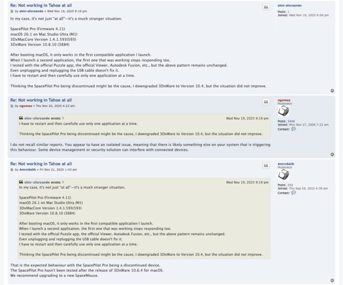 macOS Tahoe 26にアップデートしたら、Space Pilot Proが動かなくなった。